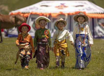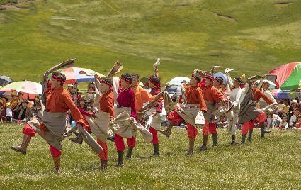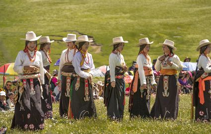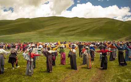據說(shuō)早在吐蕃時(shí)期,人們以村寨為單位,在本教僧人的帶領(lǐng)下高舉幡桿,手拿青棵、麥穗,繞田間地頭轉圈,祈禱神靈保佑,獲得豐收。儀式結束后,就在草場(chǎng)上展開(kāi)角斗、斗劍、耍梭標等活動(dòng)。格魯派興起后,這一活動(dòng)仍得到保留,只是在繞地巡游時(shí),人們要舉佛像、背經(jīng)文,文體活動(dòng)也增加了賽馬、射箭、馬術(shù)、藏戲、民間歌舞等內容。解放后,革去了繞地巡游等一些宗教儀軌,增加了許多休閑娛樂(lè )、物資交流的內容?!巴潯睕](méi)有固定日期,各地根據農事而定,一般在秋收前(8月)擇吉日舉行,時(shí)間1-3天。