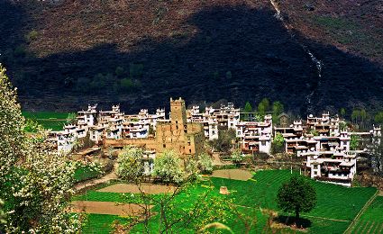丹巴藏寨是嘉絨藏寨中最具特色的。尤以甲居、聶呷、革什扎和巴底鄉最為突出,冰川雪線(xiàn)之下,村落散布,一幢幢民居依山就勢、錯落有致地融于自然環(huán)境中,體現了天人合一的理念。遠遠看去,充滿(mǎn)靈氣的山谷中,翡翠般的青草綠樹(shù)之中,是那沉甸甸的田地和隱在密林深處的寨房,伴著(zhù)潺潺溪流,一幅富有動(dòng)感的絕妙山寨畫(huà)卷隨之展示在你的眼前。