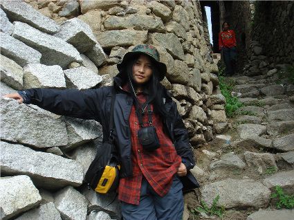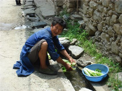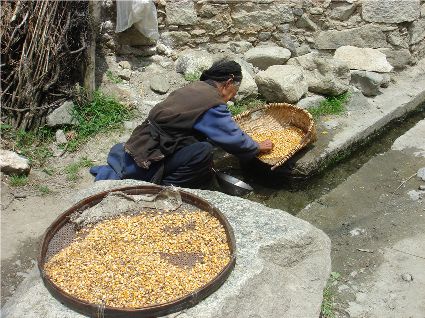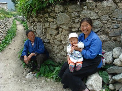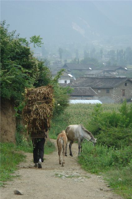那天清晨,我們一行就乘坐曉雨哥所開(kāi)轎車(chē)從康定城出發(fā)了。從顯得很懸的山路上到位于山頂平壩的嵐安古鎮時(shí),才8點(diǎn)過(guò)一點(diǎn)。朝鎮里走去,先后見(jiàn)到了從地里背洋芋回家的小孩、從地里收了豆菽枯藤的中年人等。