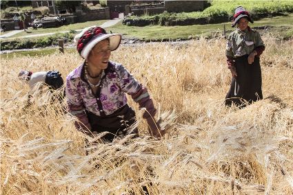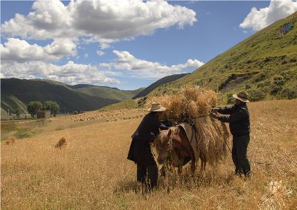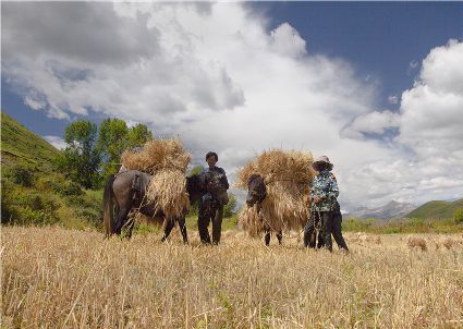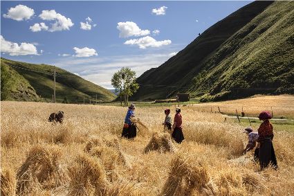 八月起迄,當你翻越西出爐關(guān)第一隘口的折多山,下山十里就會(huì )看到山地田野里成熟的青稞、麥子象展開(kāi)一頁(yè)頁(yè)金黃的詩(shī)篇涌進(jìn)眼里。那大地山坡起伏驛動(dòng)的金箔等待著(zhù)走進(jìn)主人的碉樓……這個(gè)時(shí)候,正是秋收的開(kāi)始。