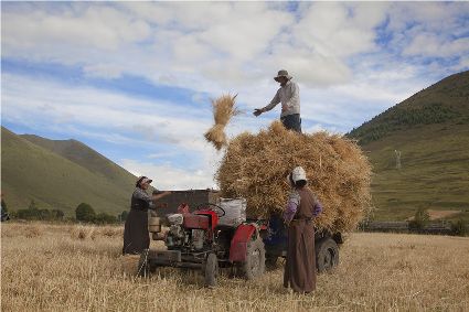 聯(lián)合收割機已在高原大地施展威力。那些平坦的大地里,拖拉機的穿梭,收割機的鳴唱,耳聞目睹,隨外可見(jiàn)。在山地間,大型機械無(wú)法進(jìn)入的地方,原始的勞作仍沒(méi)失去它本身的價(jià)值。“汗滴禾下土,粒粒皆辛苦”的場(chǎng)面仍然存在……農人的歡歌喜語(yǔ)浸漫于天地間,豐收的喜悅早把辛勤的勞作沖淡。
