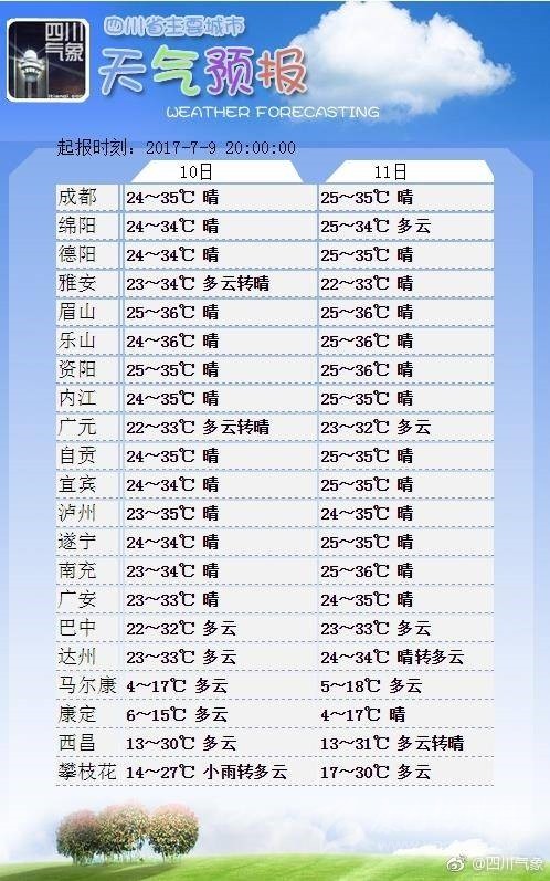 10日晚上到11日白天:盆地各市晴間多云,其中北部部分地方有分散性陣雨或雷雨;川西高原多云間陰天,大部分地方有陣雨或雷雨,其中甘孜州西南部有中雨,攀西地區晴間多云。