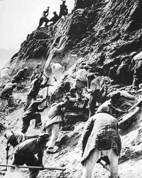 當年川藏公路建設現場(chǎng)。(翻拍自二郎山隧道展板)