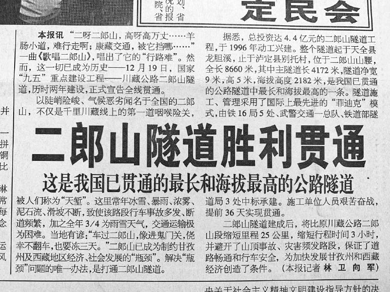 二郎山是川藏公路第一天險。1998年,當時(shí)全國最長(cháng)和海拔最高的公路隧道——川藏公路二郎山隧道全線(xiàn)貫通,《四川日報》1998年12月21日第1版、23日第5版連續刊發(fā)報道,濃墨重彩地記錄了這一歷史時(shí)刻。日前,本報記者王眉靈和當年采寫(xiě)川藏公路二郎山隧道全線(xiàn)貫通報道的老記者林衛一起,重訪(fǎng)二郎山隧道,回顧進(jìn)藏公路幾十年來(lái)的巨變。