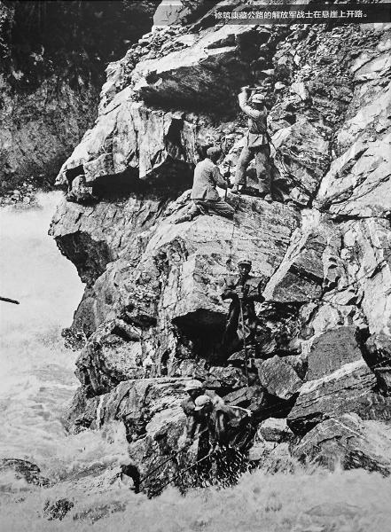 走過(guò)浮雕不到20米,一面組圖形成的墻面吸引了大量觀(guān)眾。一幅解放軍戰士在懸崖上開(kāi)路的照片給人帶來(lái)巨大的視覺(jué)沖擊,這是當年川藏公路修筑時(shí)的一幕,文字注解寫(xiě)著(zhù):1954年12月,貫通“世界屋脊”的康藏公路、青藏公路全線(xiàn)通車(chē),結束了西藏沒(méi)有公路的歷史……1955年10月,康藏公路改名為川藏公路。