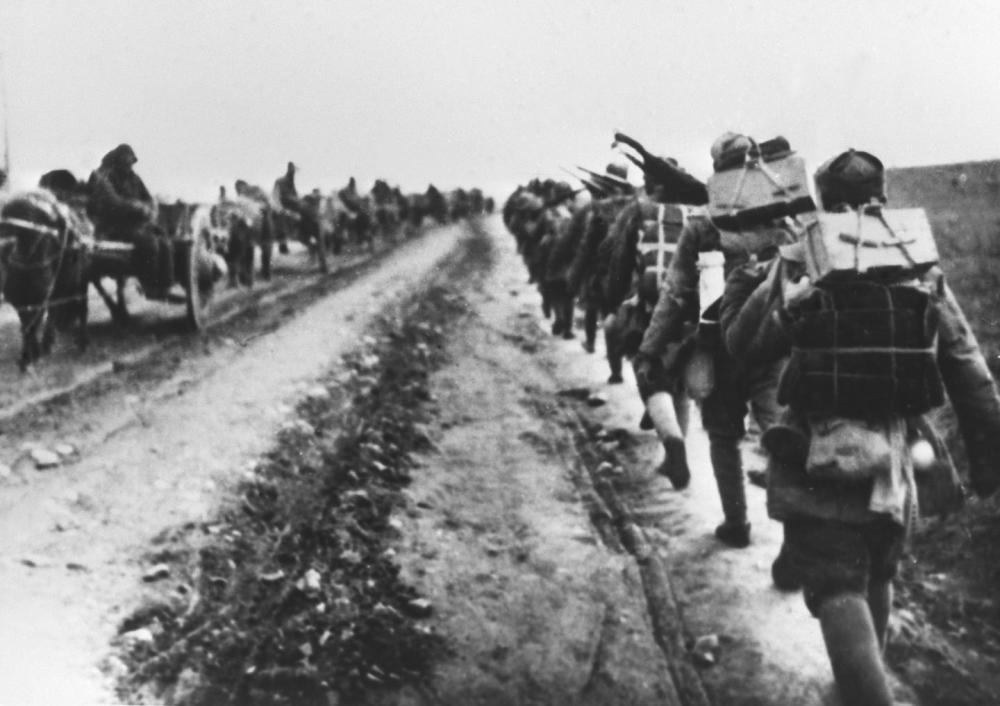 ↑ 抗日戰爭期間,新四軍在蘇北冰天雪地中行進(jìn)。