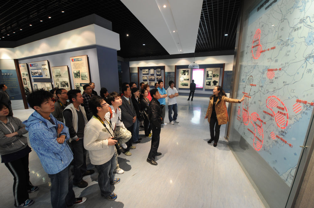 ↑ 在鹽城新四軍紀念館內,講解員在向觀(guān)眾介紹南方紅軍游擊隊整編為新四軍示意圖(2011年5月26日攝)。