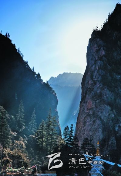 進(jìn)得溝來(lái),卻又是另一番景致。溪水在窄細(xì)的深谷中忽隱忽現(xiàn),水聲叮咚,時(shí)而從碎石卵灘下潛淌,時(shí)而冒出雪花樣的身影,不張揚(yáng),含靦腆,與兩邊千仞峭崖的兇猛樣恰成強(qiáng)烈對(duì)比。此時(shí)容不得你不抬頭望山,望天了。極盡險(xiǎn)峻的峭壁奇峰,危巖巨石,陰面如潑了墨暈,陽(yáng)面露了慘白,硬硬地把個(gè)溝谷擠成了“一線天”,駭?shù)谜锪锏奶焐弦粌蓤F(tuán)亂云也不敢停歇片刻,欲飄走,卻又被錯(cuò)落參差的山峰撕得七零八落。更有那墨黑如黛的松柏齊齊地排隊(duì)豎立在危崖峭壁間,或一兩階,或三四階,如挎刀武士護(hù)著峭崖,又如黑大漢長(zhǎng)的亂糟糟的絡(luò)腮胡,徒增添了猙獰之貌。傳說(shuō)皮察溝內(nèi)有座黑教的神山——呷拉神山,每到“朝山會(huì)”,農(nóng)牧民前去神山朝拜。然而,呷拉山頂不知何時(shí)棲居了一只碩大的“夏甲曲絨”(意為一種兇惡的鳥(niǎo)),不時(shí)將村里百姓的牛、羊叼到山頂吞食。藏王格薩爾得知此事,決心要除掉“夏甲曲絨”。 “夏甲曲絨”得知格薩爾王大軍前來(lái)征服它,十分懼怕,數(shù)日藏于洞中不敢出來(lái)。格薩爾王隱身于巖石背后,讓王妃珠牡設(shè)法引“夏甲曲絨”出洞。“夏甲曲絨”形體碩大,棲息的洞無(wú)法掩其全身,頭部露在外面,時(shí)時(shí)觀察動(dòng)靜。珠牡到接近洞口的地方,滔滔不絕地贊譽(yù)“夏甲曲絨”長(zhǎng)得美麗,它禁不住贊美,漸漸地伸長(zhǎng)頭頸,最后驕傲地露出潔白的全身,并高昂著頭。格薩爾王趁機(jī)迅速?gòu)埞罴患渲?ldquo;夏甲曲絨”的頸部,血流滿山,以后這座山便變成了紅山。當(dāng)“夏甲曲絨”負(fù)痛逃至皮察溝“一線天”時(shí)已精疲力竭,便停留在山崖中。格薩爾王隨即趕到,藏于灌叢,背靠巨石用腳一蹬(至今天一巨石呈凹形,似有人蹬過(guò)),再次射中“夏甲曲絨”。“夏甲曲絨”負(fù)痛逃去,停在覺(jué)然村一巨石上做垂死掙扎時(shí),它的爪爪在巨石一抓了無(wú)數(shù)道溝痕,后人把這個(gè)巨大石稱為“鬼抓石”……我無(wú)意去尋找“紅山”、“腳蹬石”、“鬼爪石”等,也沒(méi)想深究格薩爾除妖是否用過(guò)“美人誘惑計(jì)”,但卻在溝谷里發(fā)現(xiàn)一個(gè)與眾不同的現(xiàn)象:在一處窄小的谷地路傍,長(zhǎng)滿了雜枝黑蔓的灌叢,灌叢上彩幡密布,鉆進(jìn)灌叢,里邊竟然塑了一尊格薩爾王的神象,神象不高大,卻威儀,的確像是藏在崖壁下灌叢中……很容易讓人想到故事中的情節(jié)。