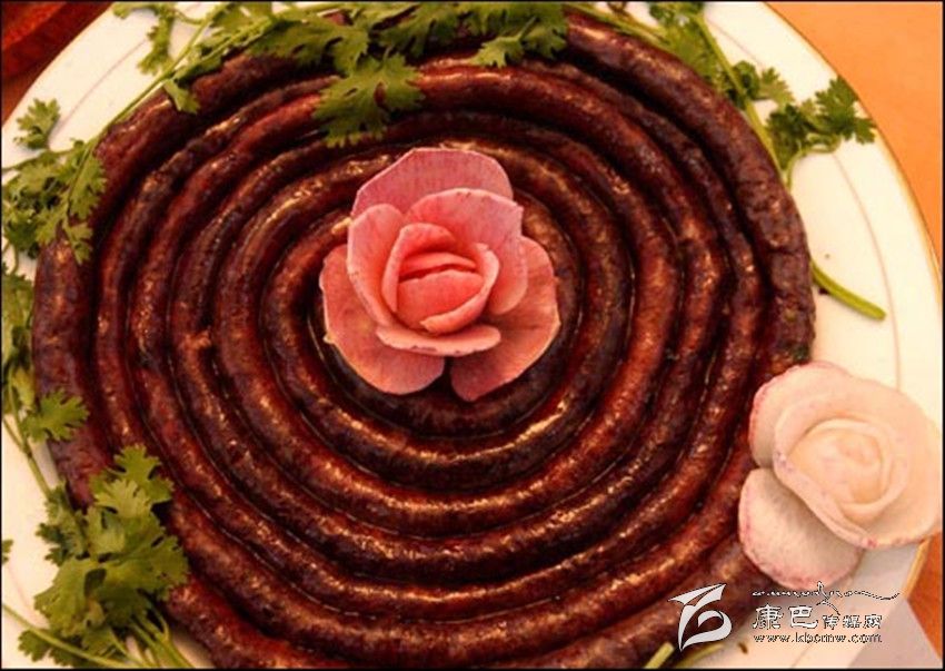 (4)血腸的烹煮,將灌好的血腸,放開(kāi)湯中煮沸,煮至血腸浮起,腸成灰白色,約八成熟時(shí)便起鍋,裝入盤(pán)內,全家席地圍坐,割而食之。