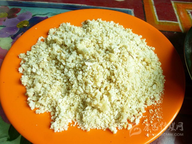 奶渣是奶提煉酥油后剩下的物質(zhì),經(jīng)燒煮,水份蒸發(fā)后,剩下是奶渣,奶渣可以做成奶餅、奶塊。在煮牛奶過(guò)程中,還可揭起奶皮,藏語(yǔ)叫“比瑪”。奶皮就像豆腐皮一樣,好吃又富有營(yíng)養。奶品是藏族的重要食品,家居或外出,人們都帶上它。在零食品種不多的藏區,大人們常把奶渣給小孩當零食。麻森在盤(pán)子里放上適量的糌粑、酥油、碎奶渣及碎紅糖,攪混揉合,盛入一方形小木盒內,用手塞滿(mǎn)、壓實(shí),即可制成麻森方形糕,其味香甜可口。