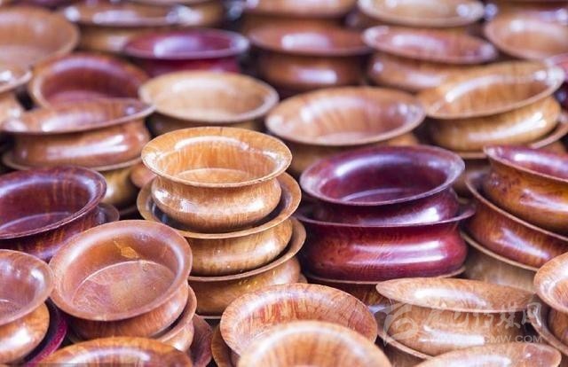 按藏族傳統,一般人使用得最多的餐具是木碗。木碗一般用樺木、雜木雕琢而成,質(zhì)地結實(shí),不易破裂,花紋細膩,較為美觀(guān)。木碗的制作過(guò)程,一是選材,二是風(fēng)干,三是制坯,四是細磨,五是上色。藏族木碗可分為大碗、小碗、蓋碗、套碗、木缽等多種,用途廣泛,可供喝茶,吃糌粑,存放食品、香料、佐料等,而且還具有光滑、細致、美觀(guān)、適用、不變味、喝茶香、攜帶方便等特點(diǎn)。雜木碗還有防毒的優(yōu)點(diǎn)。至于純金、純銀做成的勺子、筷子、碗和盤(pán),雖然在民間也能見(jiàn)到,但畢竟不是被普遍使用的生活用品,一般給客人奉茶都使用瓷碗。