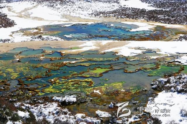 泉華灘位于貢嘎山西坡,為鈣化地貌,灘長(cháng)900多米,寬100余米,依山而下形成5個(gè)泉華階地。每個(gè)階地上有數十個(gè)大小不同、形態(tài)各異的五色彩池,池中有羌活魚(yú)自在游弋。在泉華灘的頂上有一道趵突泉,不間斷地突然從地底噴發(fā),十分壯觀(guān)。